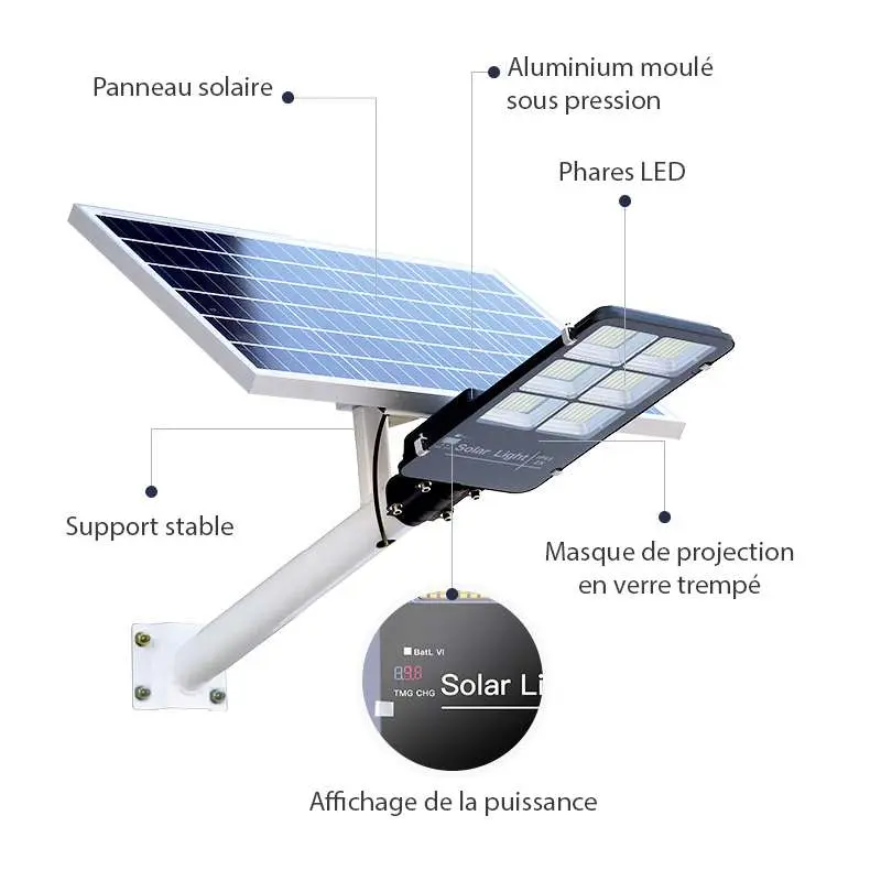 En choisissant le lampadaire solaire de 200W, vous optez pour une solution d’éclairage extérieur durable, efficace et respectueuse de l’environnement. Grâce à sa technologie solaire, il est non seulement économique mais aussi écologique.