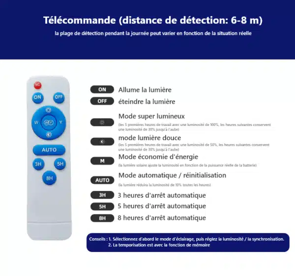 Grâce à sa fonction de contrôle par télécommande, l’éclairage se charge pendant la journée et s’allume automatiquement le soir. En fonction du mode sélectionné, l’éclairage peut durer du crépuscule à l’aube ou passer sur un des modes automatiques. Vous pouvez donc choisir le mode qui convient le mieux à vos besoins d’éclairage extérieur.