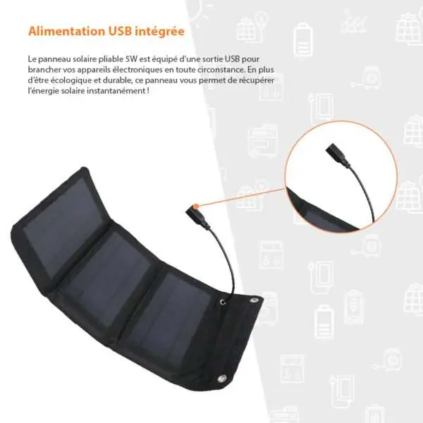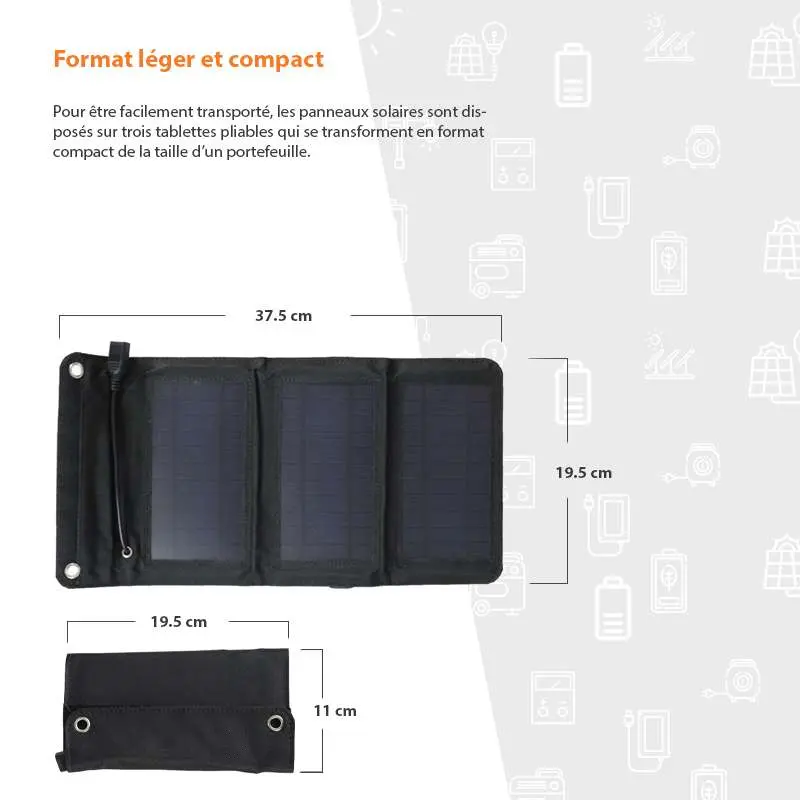 Idéal pour les activités en plein air comme le camping, la pêche et la randonnée, il vous servira pour recharger vos appareils électroniques tels que les téléphones portables, power Bank, ou tout autre matériel rechargeable en USB.