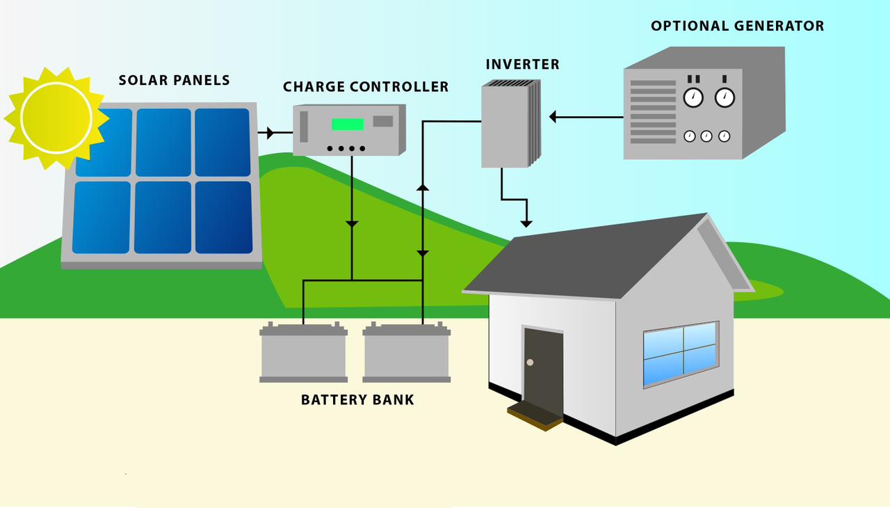 Généralement, ces kits sont constitués de panneaux solaires photovoltaïques, d’un régulateur de charge, de batteries et d’un ou plusieurs onduleurs. Nous pouvons éviter d’utiliser un onduleur si nous n’avons que des applications avec des appareils 12V ou 24V DC (par exemple sites de télécommunications 48Vdc, besoins d’éclairage 12Vdc, réfrigérateurs DC, etc.)